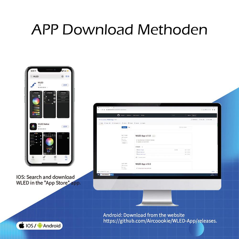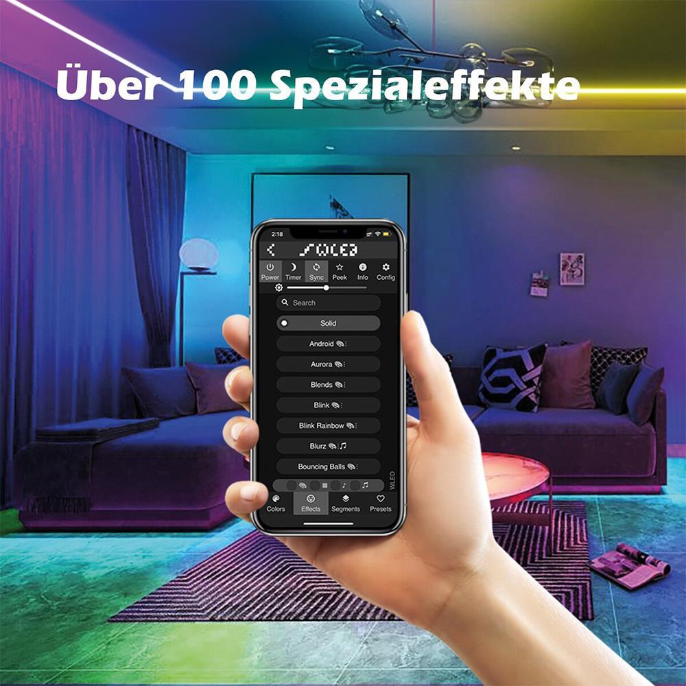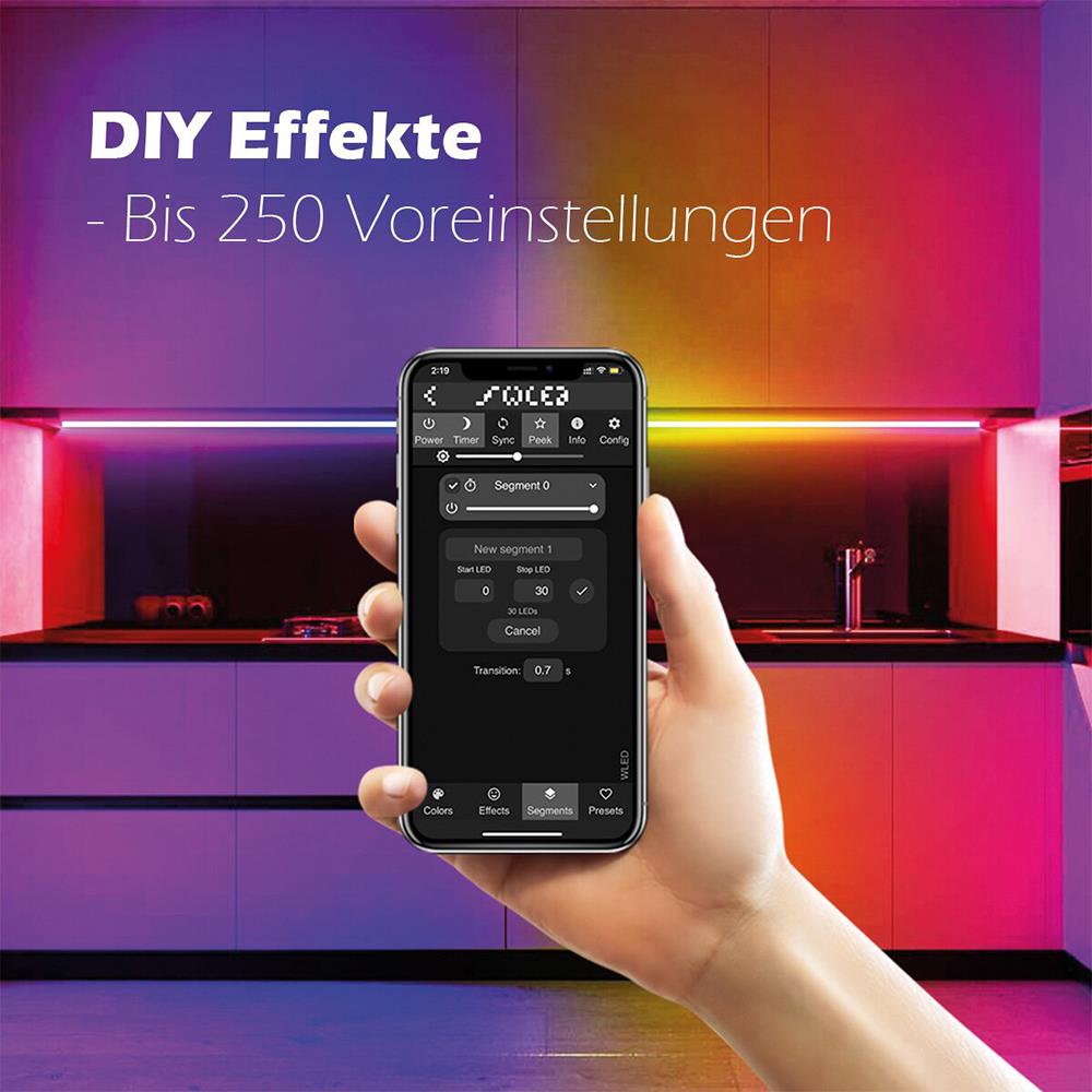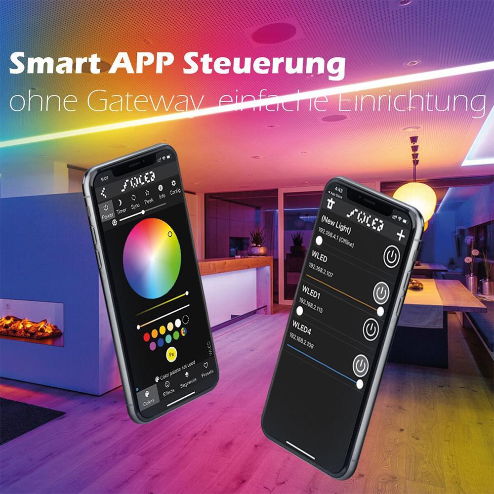 Einfache App-Steuerung: Die WLED-App ermöglicht dir die bequeme Steuerung deiner Lichtstreifen direkt von deinem Smartphone aus. Ändere Farben, Helligkeit und Effekte ganz einfach mit einer Berührung.