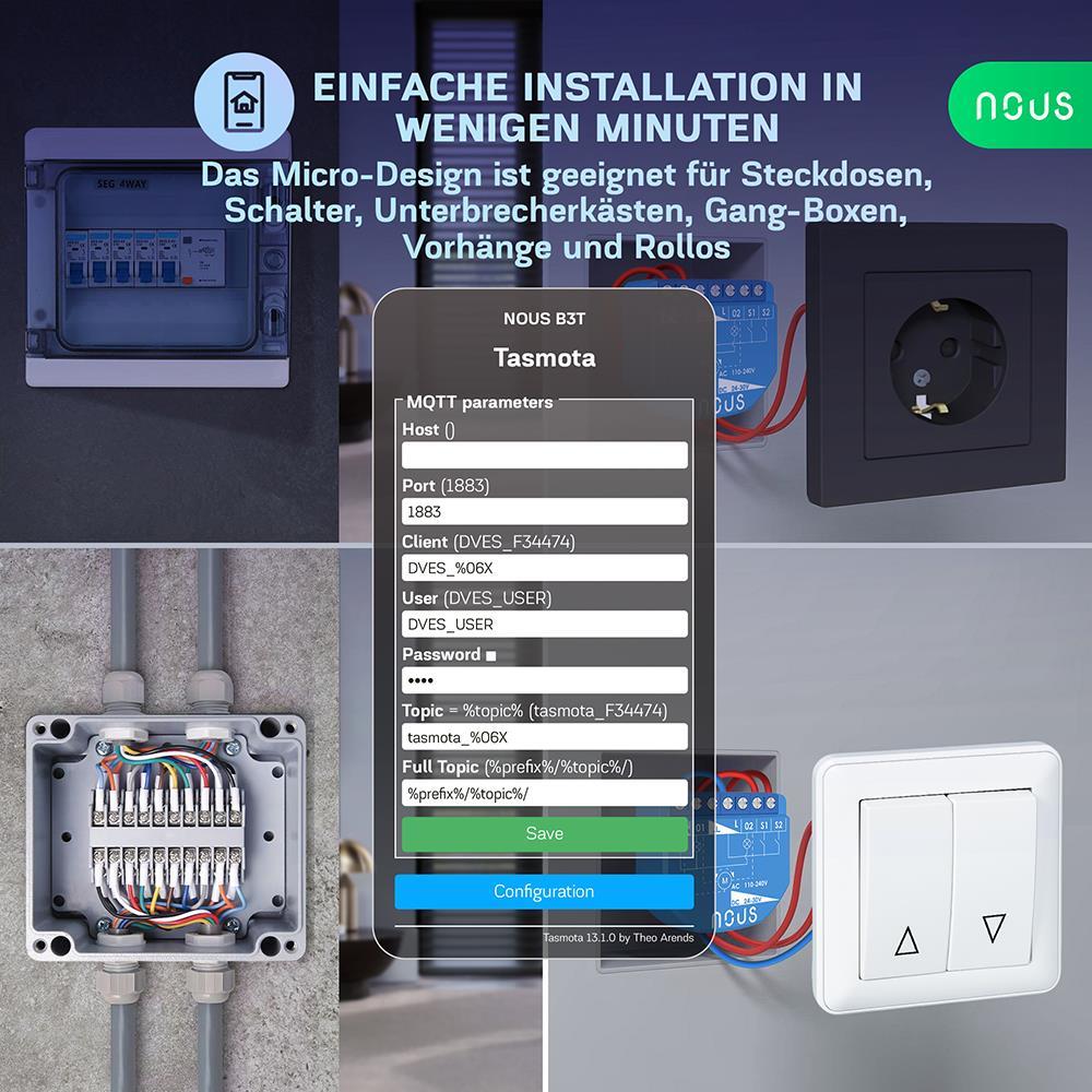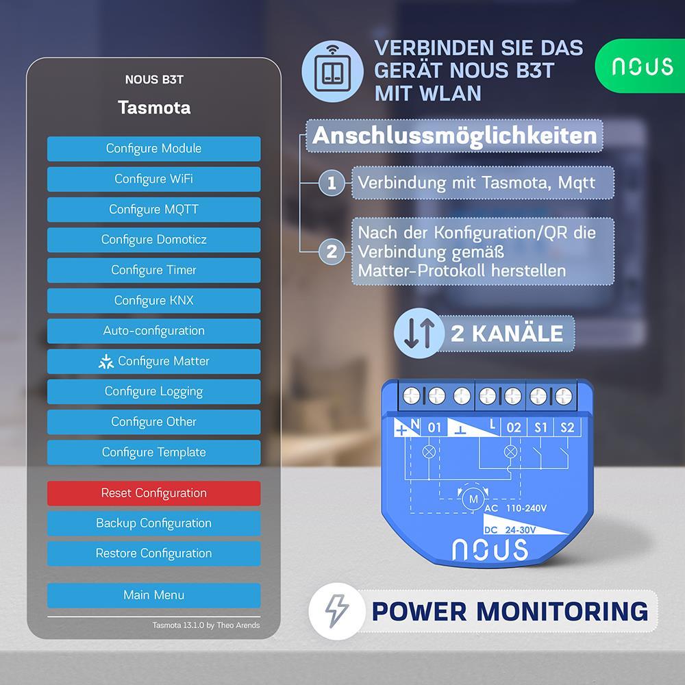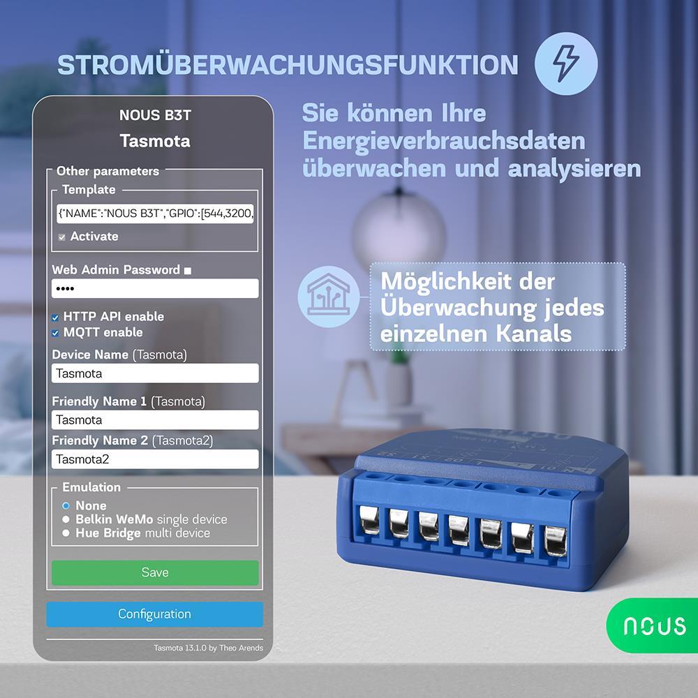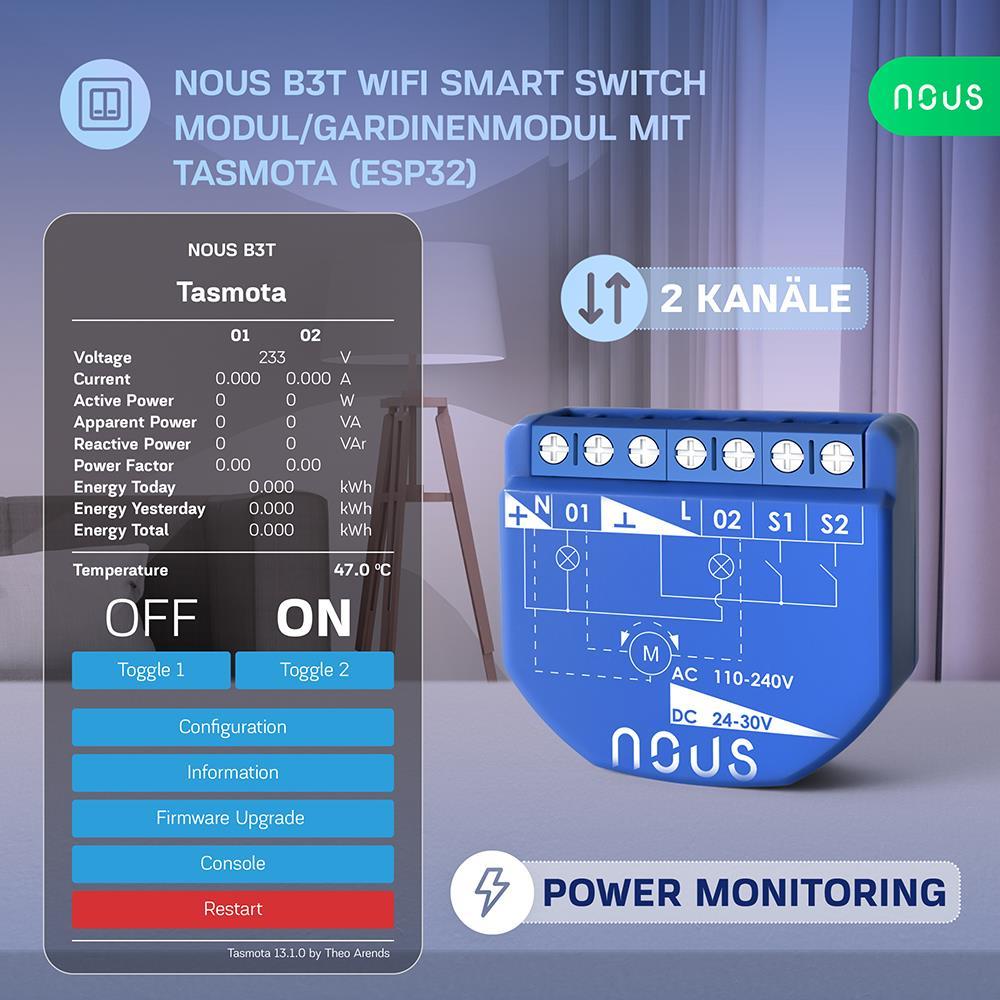 NOUS B3T WiFi Smart Switch 2 Kanal ESP32 Power Metering Tasmota opt. calibrated