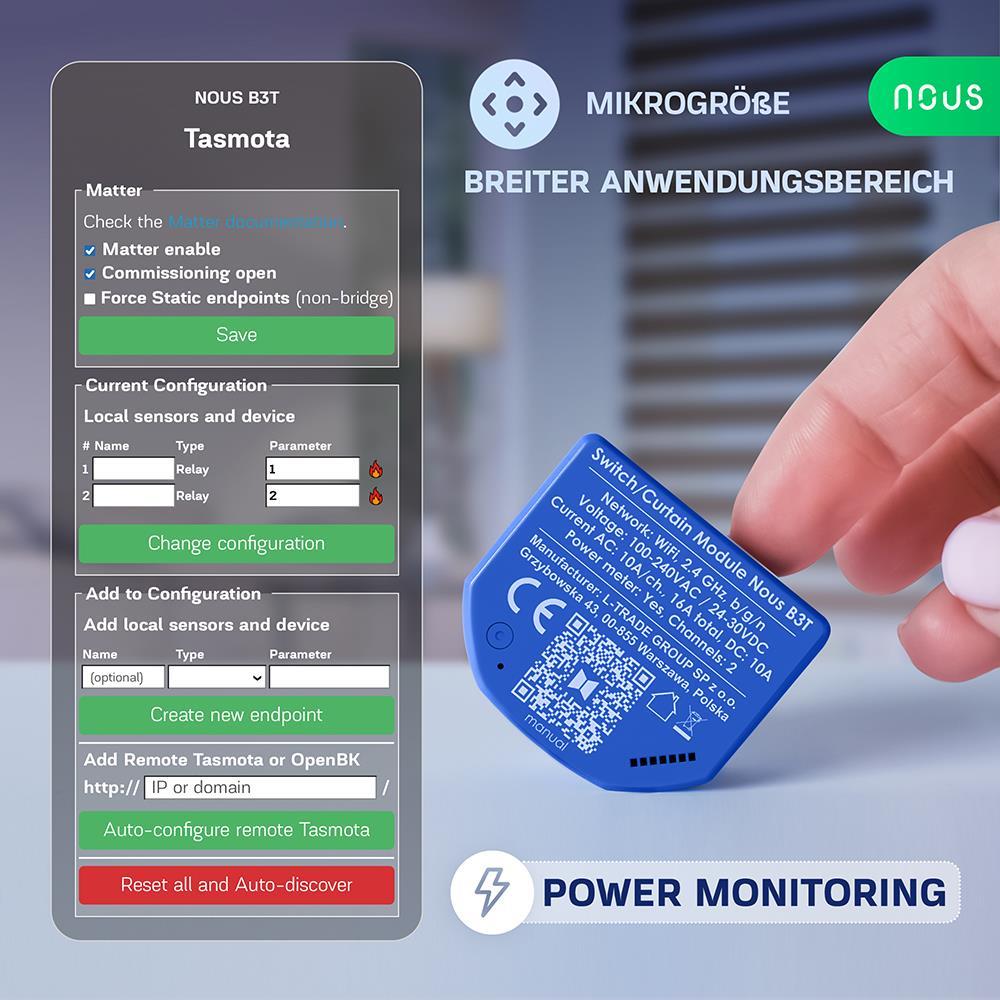 Besondere Merkmale: ESP32-MINI-1 Modul, 4 MB Flash, vorinstalliertes Tasmota, Temperatursensor, MATTER Unterstützung, MQTT Unterstützung, 2 Kanal, Leistungsmesser / kann als Rollladenschalter/Vorhangmodul verwendet werden (siehe Handbuch)