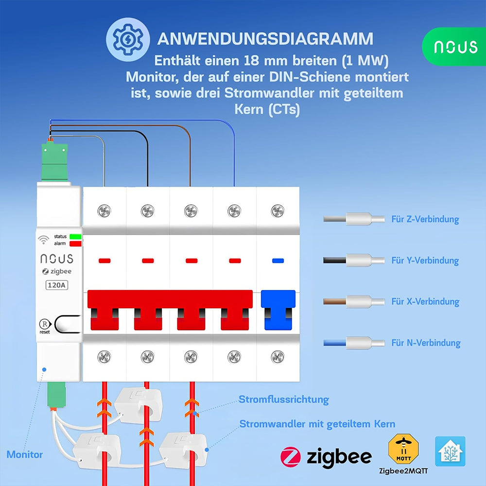Nous D4Z Zigbee Smart DIN 120A 3 Phasen Energiemonitor Bidirektional Zigbee2MQTT