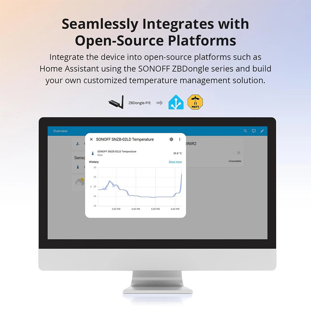 Der SNZB-02LD ist kompatibel mit Zigbee-Hubs, die das Zigbee-3.0-Protokoll unterstützen, z.B. SONOFF iHost, NSPanel Pro, ZBBridge-P, ZBBridge-U, ZBDongle-E, ZBDongle-P, Amazon Echo der 4. Generation, Echo Show (2. Gen) und Echo Plus (2. Gen). Er lässt sich außerdem problemlos in Open-Source-Plattformen wie Home Assistant integrieren – z.B. über SONOFF ZBDongle-P/E, den Home Assistant SkyConnect, Connect ZBT-1 oder Zigbee-Multiadapter von SMLIGHT (SLZB-Serie) – und ermöglicht so eine individuell konfigurierbare und lokale Temperaturmanagement-Lösung, komplett ohne Cloud.