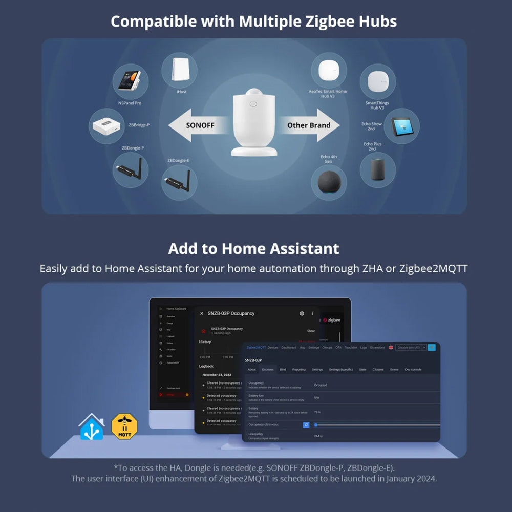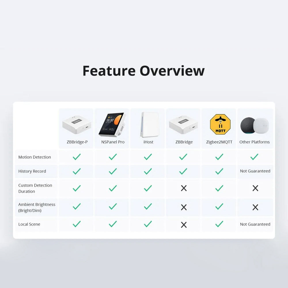 Der SONOFF SNZB-03P ist mit mehreren Zigbee-Hubs kompatibel, darunter der SONOFF NSPanel Pro, SONOFF iHost, SONOFF ZB Bridge Pro, SONOFF ZBDongle-E, SONOFF ZBDongle-P und Echo Plus 2. Generation, was die Möglichkeiten für dein Smart-Home-System erweitert.