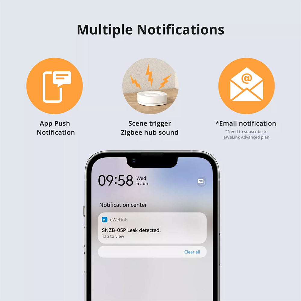 Echtzeit-Benachrichtigungen & Mehrfache Alarme: Der SNZB-05P sendet sofort Push-Benachrichtigungen an dein Handy, wenn eine Wasserleckage erkannt wird. Selbst bei einem WLAN-Ausfall können lokale Zigbee-Szenen den Alarm des Gateways auslösen.