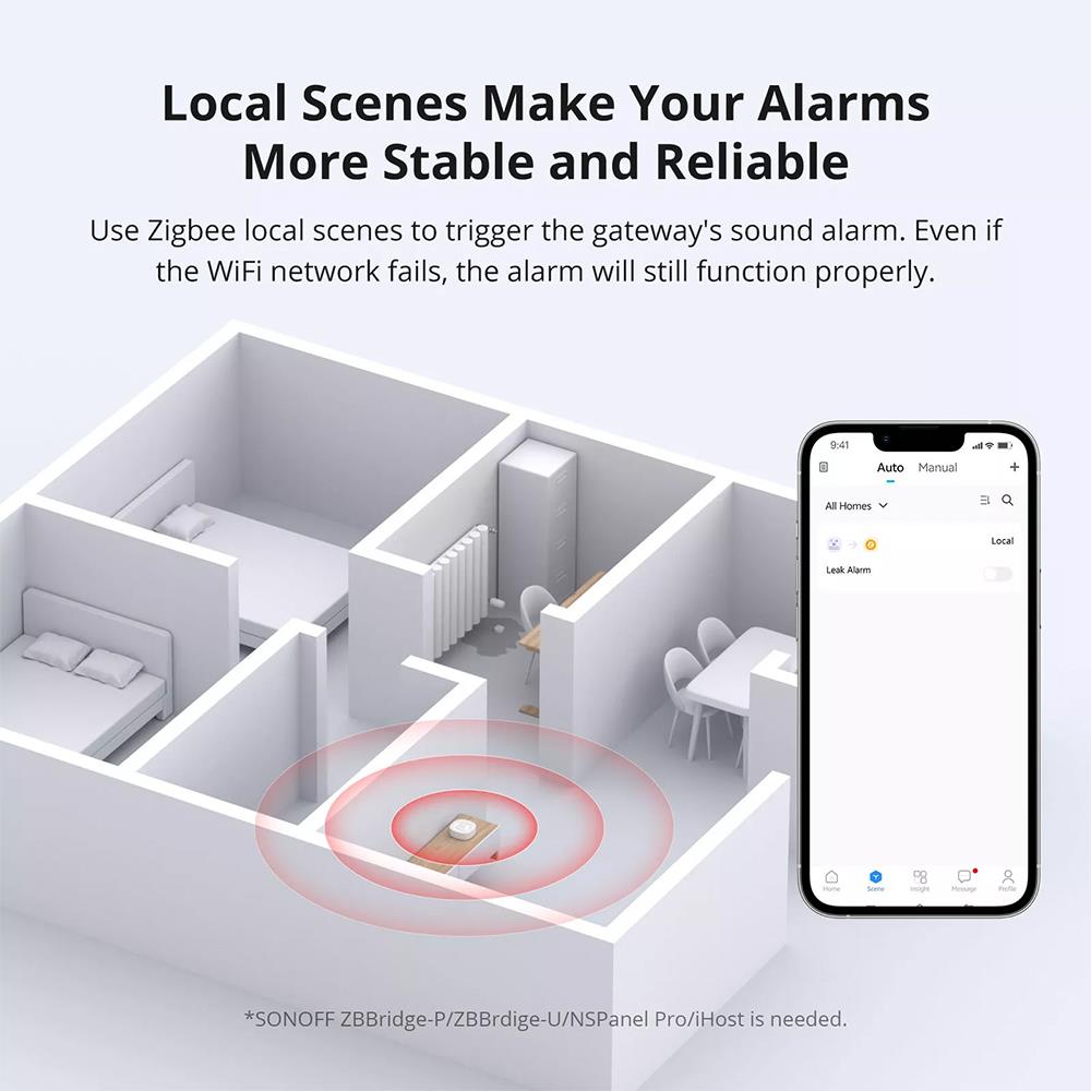 Echtzeit-Benachrichtigungen & Mehrfache Alarme: Der SNZB-05P sendet sofort Push-Benachrichtigungen an dein Handy, wenn eine Wasserleckage erkannt wird. Selbst bei einem WLAN-Ausfall können lokale Zigbee-Szenen den Alarm des Gateways auslösen.