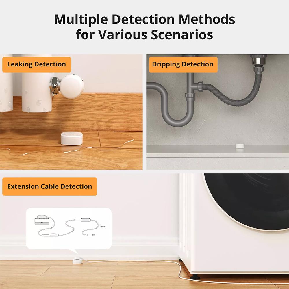 Erweiterte Erkennungsmöglichkeiten: In Verbindung mit einem Wasserleck-Erkennungskabel (separat erhältlich oder im Sensorkit enthalten) kann der Sensor sowohl für großflächige Erkennung als auch für präzise Inspektionen in engen Bereichen genutzt werden. Das Verlängerungskabel lässt sich beliebig in Reihe schalten, ohne eine Begrenzung der Gesamtlänge.